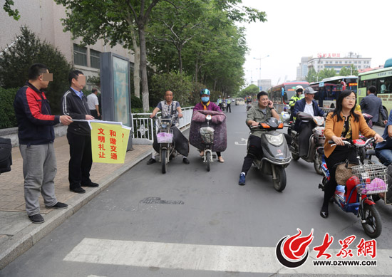 今天上午11點多,大眾網(wǎng)記者來到經(jīng)十緯一路口,多名交警正在這里開展路口秩序整治行動。11:35左右,一名騎電動車的男子在非機動車道逆行被交警當場攔下。民警遞給這名王姓男子一面印有“文明禮讓 和諧交通”的小黃旗,要求他在路口維持交通秩序20分鐘。