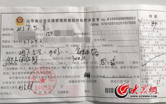 濟南交警市中大隊開出的行人闖紅燈罰單,顯示罰款金額為20元