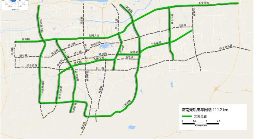 記者了解到,山東泉城綠色現代無軌電車公交示范項目在2016年2月列入亞洲開發銀行貸款2016-2018年備選項目規劃,獲得亞洲開發銀行貸款1.5億美元。濟南規劃了“五環九射”現代無軌電車網絡,線網總長度201.4公里。后來結合濟南實際,經過專家論證,優化調整為111.2公里。