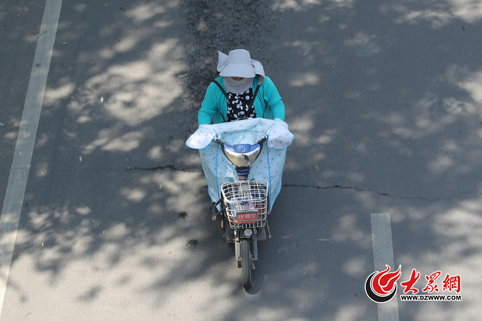 15月27日,濟南迎來新一輪的高溫天氣,在烈日的灸烤下,外出的市民紛紛想出各式奇招遮陽降溫。據(jù)濟南市氣象局發(fā)布的消息,26日,發(fā)布今年首個高溫黃色預(yù)警信號,27-29日濟南大部分地區(qū)最高氣溫可達35-36 ,市區(qū)、章丘、濟陽的部分地區(qū)最高氣溫可達37℃。圖為市民“全副武裝”在高溫下騎車出行。大眾網(wǎng)記者 王長坤 攝