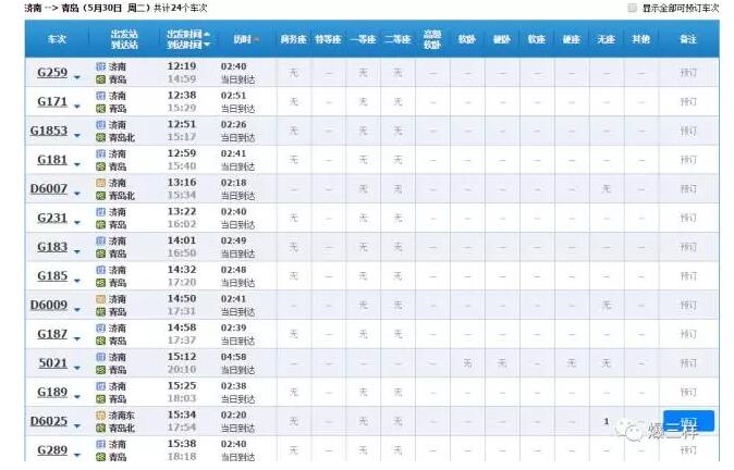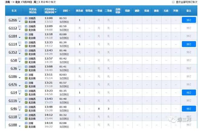 爆三樣從12306網站查詢發現,截止今天下午1點時,5月30日從濟南開往北京的車次中,中午12點之后發車的高鐵車票僅剩十幾張,快速列車僅剩少量硬座車票。