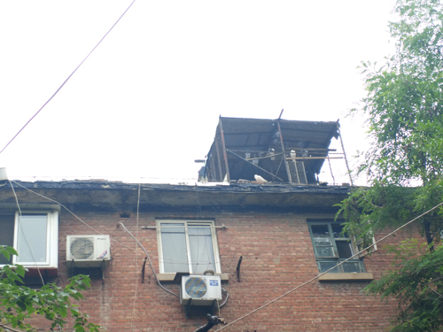 臨近11號樓搭建鴿籠一側的住戶院墻上粘滿羽毛的紗窗