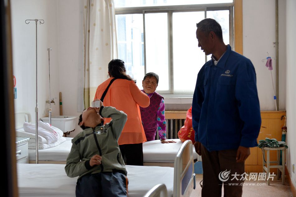 今年14歲的高雄(化名),來自陜西省榆林市子洲縣,患有先天性白內障,左右眼視力均是0.2。其父親也是白內障患者,三年前做過手術。目前,高雄正在讀初中一年級,其11歲的弟弟也是一名白內障患者。圖為高雄正在病房滴術前的眼藥水,等待護士來接他去手術室。楊艷麗 攝