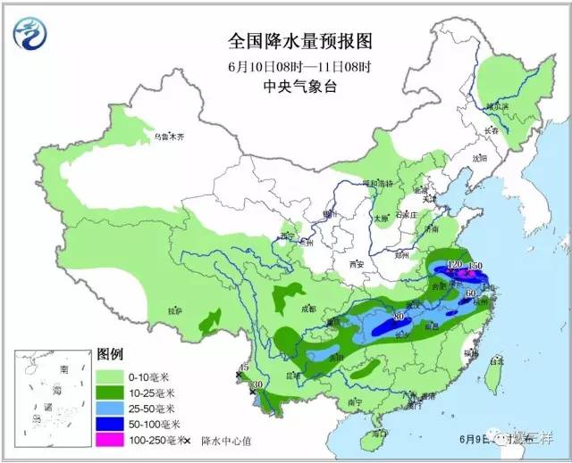 重回雨季的不僅是山東。在我國南方,進入6月以來的第3場強降雨即將來襲。受高空槽及低渦切變線影響,6月9日至11日, 西南地區東部、黃淮南部、江漢、江淮和江南北部等地自西向東將有大范圍明顯降雨過程,最強降水時段為9日夜間至10日。其中,陜西南部、四川盆地東部、重慶北部和西部、河南東南部、湖北、湖南北部、安徽、江西北部、江蘇中南部和浙江中北部等地的部分地區有暴雨,局地有大暴雨(100~150毫米);上述部分地區并將伴有短時強降水,小時雨強可達30~60毫米,最大可達80毫米以上,局地伴有雷雨大風或冰雹。為此,中央氣象臺6月9日06時繼續發布暴雨藍色預警。