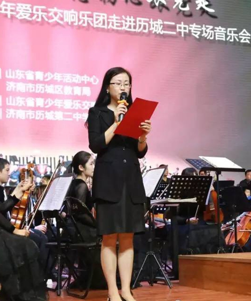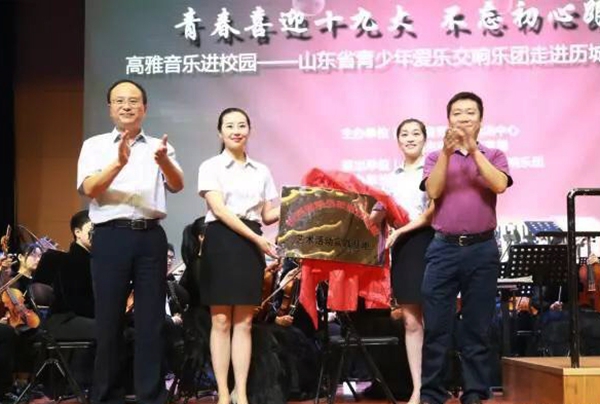 音樂會開始前,首先舉行了揭牌儀式,山東省青少年宮(籌)主任郝焱與歷城區教育局副局長兼歷城二中校長李新生共同為“山東省青少年活動中心藝術活動實踐基地”揭牌。“中心”和歷城二中達成協議,今后將共同開展藝術實踐、教育培訓、國內外青少年交流等各項活動。隨后,李新生校長和山東省青少年活動中心藝術團團長錢景霞分別致辭,強調了音樂藝術肩負著育人的功能,以及普及高雅音樂的重要性,希望讓更多的青少年提高藝術修養和文化素質,自覺追求真、善、美的精神境界,鼓勵學生熱愛音樂,享受藝術。
