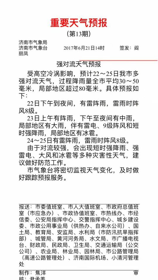 大眾網(wǎng)濟(jì)南6月21日訊 記者從濟(jì)南市氣象臺獲悉,受高空冷渦影響,預(yù)計(jì)22~25日濟(jì)南市多強(qiáng)對流天氣,過程降雨量全市平均30~50毫米,局部地區(qū)超過80毫米。具體預(yù)報(bào)如下: