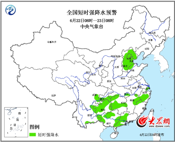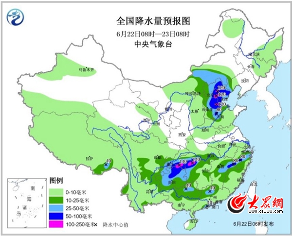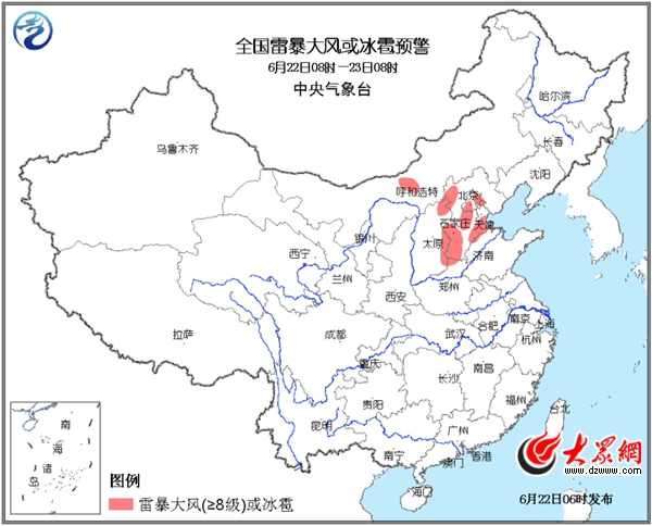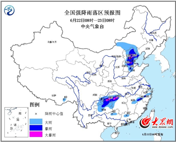 預(yù)計(jì),6月22日08時(shí)至23日08時(shí),內(nèi)蒙古中部、河北大部、北京、天津、山東西北部等地的部分地區(qū)有大到暴雨,其中北京東北部和南部、天津西北部、河北東南部等地局地有大暴雨(100~120毫米);重慶南部、貴州中北部、湖南西北部、湖北西南部、江西東北部、浙江中部、廣東北部和南部沿海、廣西北部等地有大到暴雨,其中,湖南西北部、貴州東北部、重慶東南部局地有大暴雨(100~140毫米);上述部分地區(qū)有短時(shí)強(qiáng)降水、局地伴有雷暴大風(fēng)或冰雹等強(qiáng)對(duì)流天氣,最大小時(shí)雨強(qiáng)20~50毫米,局地可達(dá)60毫米。