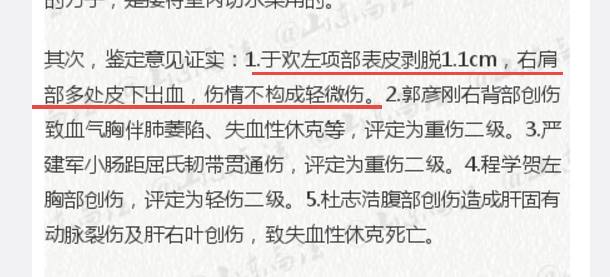 至于于歡被毆打的情節,雖然他在表示自己遭到嚴重的圍毆,但母親蘇銀霞和其他工廠工人表示并沒有看到于歡被暴力圍毆的情況,3名被他捅傷的討債者也表示他們沒有暴力圍毆于歡,只是在限制他的行動。他的傷情鑒定也顯示他身上沒有構成至少輕微傷的地方。