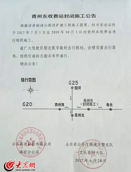 大眾網(wǎng)濟南6月25日訊 記者從山東高速交警一支隊獲悉,根據(jù)濟青高速北線擴建工程的施工需要,將于7月1日至2018年10月1日對青州東(又稱口埠、壽光西)收費站進行封閉施工。廣大駕駛員可以提前在青州西、壽光收費站下高速,或者繞行長深高速陽河、青州北收費站。(大眾網(wǎng)-山東24小時記者 賀輝)