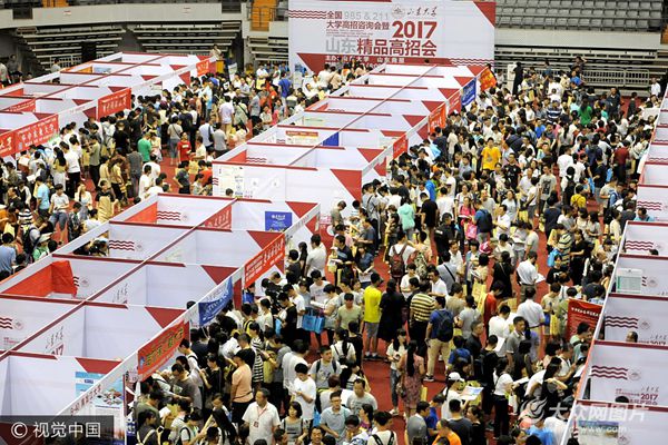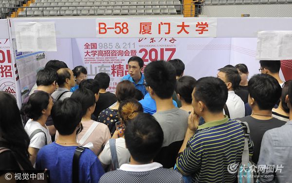 2017年06月25日,山東省濟南市在山東大學中心校區體育館,來自全國80所985&211重點大學組團舉行精品高招會。吸引了全省萬余名高分考生從各地趕來,現場的考生隨便一抓都是600分以上的成績。據了解,這是今年全國首場985&211高校專場高招會,這場“群英會”,正為學霸和名校完成一次精準對接。