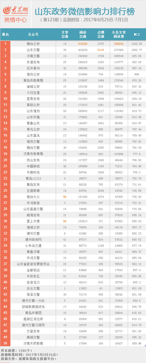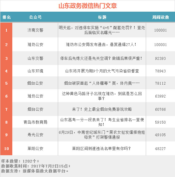 大眾網濟南7月4日訊 山東政務微信影響力排行榜本周發布第123期。本周政務榜前三甲為“煙臺公安”、“山東交警”和“濟南交警”。“齊河旅游”和“慶云交警”分別進步254和252名,并列黑馬。熱文榜兩篇文章閱讀數登頂10w+,“山東交警”單篇文章獲贊近兩千。