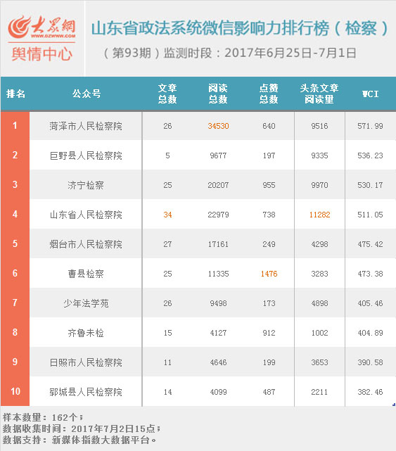 大眾網濟南7月5日訊 山東政法系統微信影響力排行榜本周發布第93期。三榜冠軍分別為“煙臺公安”、“菏澤市人民檢察院”和“山東高法”,三榜進步最快的賬號分別為“濰坊公安”、“齊魯未檢”和“諸城法院”。