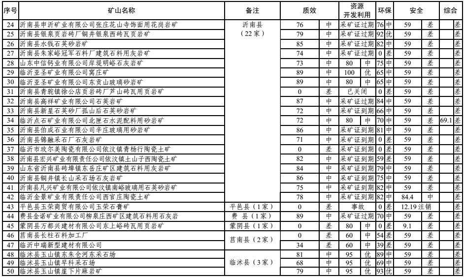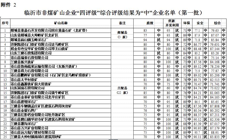 大眾網濟南7月13日訊 13日,經過近乎嚴苛綜合評級,臨沂市安委辦對外公布了第一批180 家非煤礦山企業名單。其中獲得“優評”的企業有21 家,“中評”96 家,“差評”63 家。據大眾網記者了解,此次獲得“差評”的企業,如果整改不到位,將被責令關閉淘汰;而獲得“優評”的企業,則會被列入“發展壯大一批”名單,給予重點扶持。