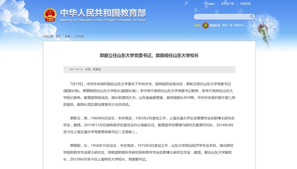 大眾網7月19日訊 據教育部網站消息:7月19日,中共中央組織部在山東大學宣布了中共中央、國務院的任免決定,郭新立擔任山東大學黨委書記(副部長級)、樊麗明擔任山東大學校長(副部長級);李守信不再擔任山東大學黨委書記職務,張榮不再擔任山東大學校長職務。教育部黨組成員、部長助理劉大為,山東省省委常委、宣傳部部長孫守剛,中共中央組織部干部三局巡視員、副局長劉后盛出席宣布大會并講話。