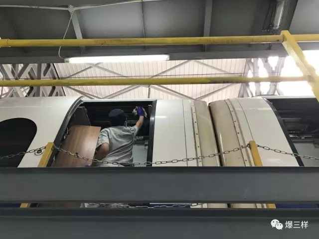 爆三樣注意到,作業車間全長400米,為了方便動車進出,車間兩頭開放,金屬結構與動車軌道錯落其中。動車機械師作業期間沒有空調,夏天的作業車間就像一個蒸籠,溫度濕度明顯高于室外。穿梭其中的機械師們身著長褲工裝,頭戴帽子,不少人的后背早已被汗水浸透。
