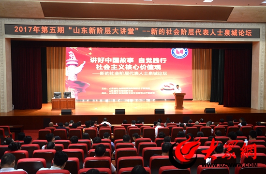 大眾網濟南7月27日訊 今天下午,第五期“山東新階層大講堂”——新的社會階層代表人士泉城論壇在濟南啟動。6名新階層代表圍繞踐行社會主義核心價值觀,結合自己的親身故事,分別作了主題演講。一個個飽蘸情感的故事深深打動了在場人員,當有代表分享他贍養別人百歲老母的故事時,臺下的掌聲久久難平。