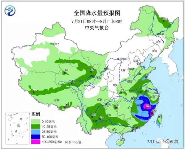 中央氣象臺7月31日10時繼續發布暴雨黃色預警:預計7月31日14時至8月1日14時,福建、廣東東部、江西東部和北部、浙江西南部、安徽西南部、湖北東部、河南東南部、山東東南部等地有大雨或暴雨,其中,福建西北部和東部、江西東北部等地的部分地區有大暴雨(100~200毫米),最大小時雨強可達60毫米。