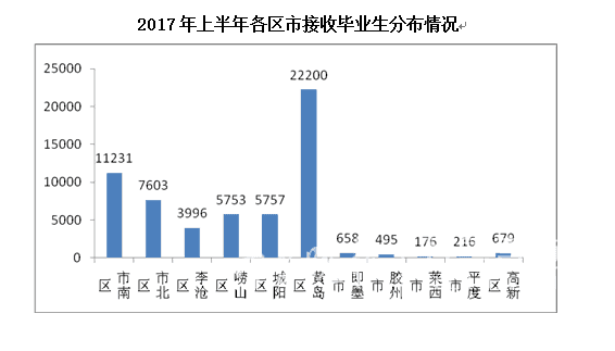 從就業區域看,吸納畢業生就業人數最多的前三位區市分別為黃島區、市南區、市北區,接收人數分別為22200人、11231人、7603人,占接收總人數的69.83%,僅黃島區接收畢業生人數占總人數37.78%。黃島區作為國家級新區,航運物流、石油化工、家電電子、船舶海工、汽車制造、機械裝備制造等六大支柱產業正圍繞著供給側需求,在產能升級的過程中不斷蛻變,煥發勃勃生機,對吸納高校畢業生就業也發揮了重要的作用。