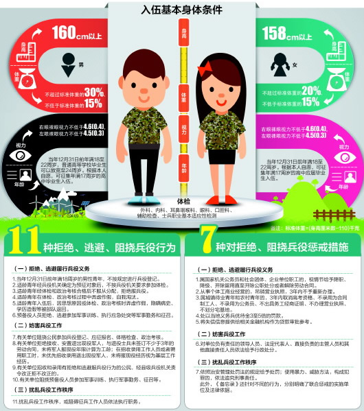 根據征兵工作計劃安排,8月1日至15日由區(市)兵役機關組織應征報名人員上站體檢;8月20日前完成政治考核;9月1日前完成役前教育訓練;9月上旬,召開定兵會議集體定兵;9月10日組織新兵起運。