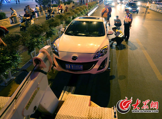 昨晚,濟(jì)南交警市中大隊對違法停車進(jìn)行拖移