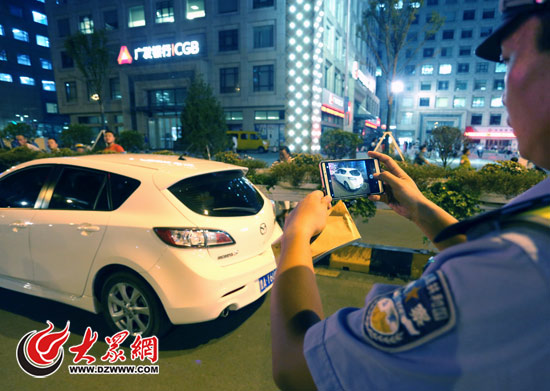 市中區(qū)交警在萬達(dá)廣場附近對違停車輛進(jìn)行現(xiàn)場取證處罰