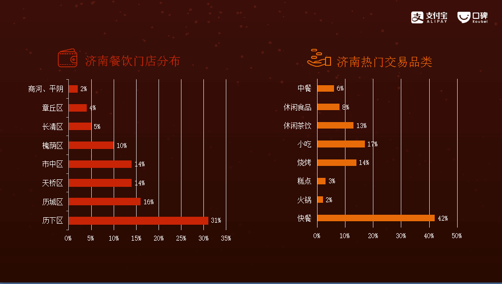 那作為省會城市的濟南,哪個區的吃貨最多?據口碑大數據顯示,濟南餐飲門店分布以歷下區最多,占比達到31%,歷城、天橋、 市中、槐蔭區以16%、14%、14%、10%的占比成為第二梯隊。