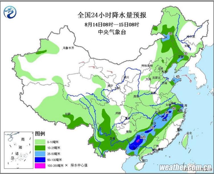 中央氣象臺8月13日18時繼續發布暴雨藍色預警:預計8月13日20時至14日20時,貴州南部、廣西北部、湖南西南部和東北部、江西北部、安徽西南部以及山東半島等地有大到暴雨,其中,廣西北部、湖南西南部和東北部、江西西北部等地局地有大暴雨(100~160毫米);上述大部地區有短時強降水,最大小時雨強可達50~70毫米,局地還將伴有雷暴大風等強對流天氣。