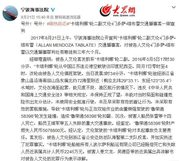 大眾網(wǎng)8月22日濟(jì)南訊記者從寧波海事法院官方微博獲悉,2017年8月21日上午,寧波海事法院公開宣判“卡塔利娜”輪二副艾倫 門多薩 塔布雷(ALLAN MENDOZA TABLATE)交通肇事案,對(duì)被告人艾倫 門多薩 塔布雷以交通肇事罪判處有期徒刑三年六個(gè)月。