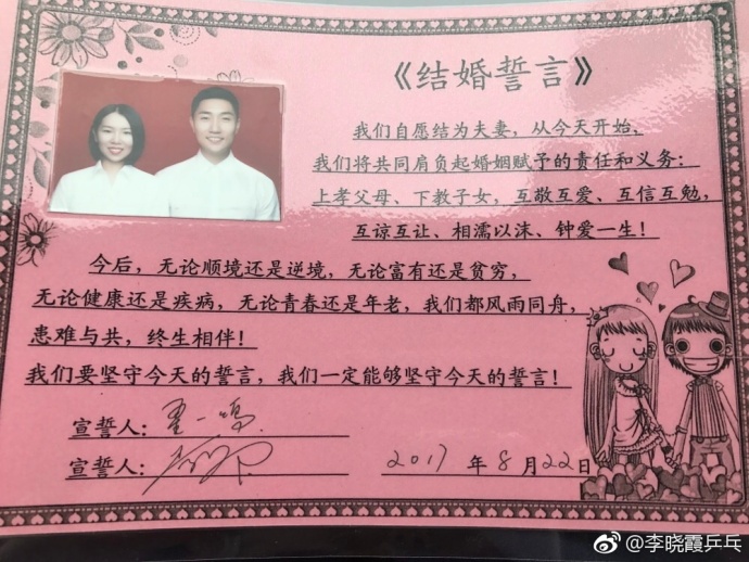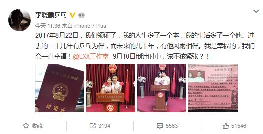 今天上午11:36,乒乓球奧運冠軍李曉霞@李曉霞乒乓突然在微博上宣布結婚喜訊:“2017年8月22日,我們領證了,我的人生多了一個本,我的生活多了一個他。”同時曬出的還有4張照片,包括結婚證、結婚誓言以及夫妻倆在和平區民政局婚姻登記處的幸福合影。照片中,這對新婚夫婦深情對視,滿臉幸福笑容。李曉霞在微博上說:“過去的二十幾年有乒乓為伴,而未來的幾十年,有他風雨相伴。我是幸福的,我們會一直幸福!”