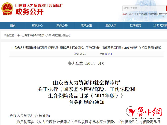 大眾網8月23日濟南訊  8月21日,山東省人力資源和社會保障廳印發關于執行《國家基本醫療保險、工傷保險和生育保險藥品目錄(2017年版)》有關問題的通知。自2017年9月1日起,全省基本醫療保險、工傷保險和生育保險統一執行2017年版《國家藥品目錄》和人社部發〔2017〕54號文件確定的36種談判藥品,藥品通用名、藥品分類、劑型和限定支付范圍等按照國家規定執行。