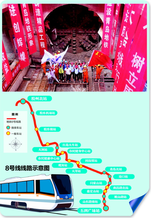 青島地鐵8號(hào)線起點(diǎn)自膠州北站,終點(diǎn)至五四廣場(chǎng),主線串聯(lián)了膠州市、紅島高新區(qū)、李滄區(qū)、市北區(qū)、市南區(qū)等五個(gè)行政區(qū),是連接青島新機(jī)場(chǎng)、北岸城區(qū)、東岸城區(qū)的快速骨干線路。線路起自國(guó)鐵膠州北站,經(jīng)膠東國(guó)際機(jī)場(chǎng)、國(guó)鐵紅島站、紅島CBD、大洋,過海至青島北站樞紐,然后經(jīng)滄口機(jī)場(chǎng)沿周口路、南昌路、山東路至香港路五四廣場(chǎng)站。正線全長(zhǎng)約61.4千米,以地下線為主。全線設(shè)車站18座,其中高架站1座,地下站17座。目前,地鐵集團(tuán)積極推進(jìn)8號(hào)線各工點(diǎn)進(jìn)場(chǎng),目前大部分工點(diǎn)已進(jìn)場(chǎng),且一半工點(diǎn)已實(shí)現(xiàn)開工。