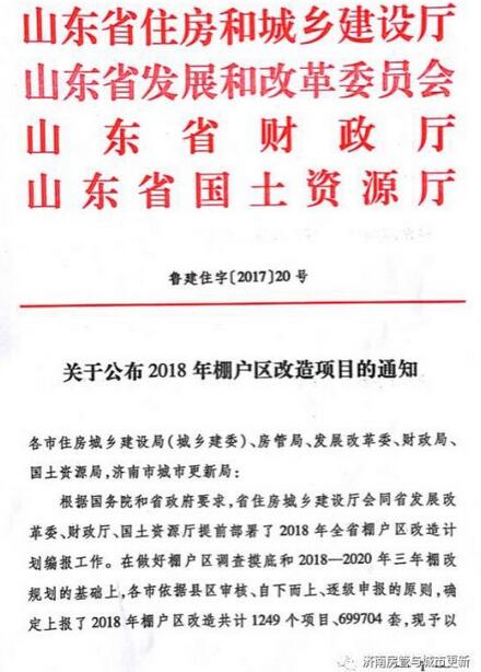 近日,山東省住建廳、山東省發改委、山東省財政廳、山東省國土資源廳聯合發布《關于公布2018年棚戶區改造項目的通知》。各市依據縣區審核、自下而上、逐級申報的原則,確定上報了2018年棚戶區改造共計1249個項目、699704套。