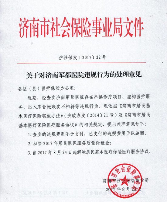 8月23日,濟南市社保局發布對2家醫院存在違規行為的處理意見。針對濟南軍都醫院,經查實,近期濟南軍都醫院存在串換診療項目、虛構醫療服務、出入庫臺賬賬實不相符等違規行為。依據《濟南市居民基本醫療保險實施辦法》(濟政辦發[2014]21號)及《濟南市居民基本醫療保險醫療服務協議》的相關規定,提出處理意見如下:查實的違規費用不予支付,已支付的違規費用予以追回;扣除2017年居民醫保服務質量保證金;自2017年8月24日起解除居民基本醫療保險醫療服務協議。