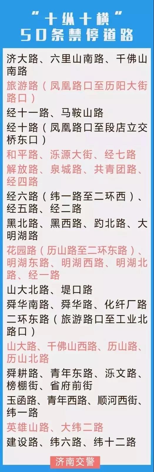 緯二路、緯十二路、經(jīng)一路、經(jīng)七路、經(jīng)十路(段店立交東口至奧體東路路口)、濼源大街、和平路、旅游路(歷陽(yáng)大街至舜華路口)、明湖東路、明湖西路、明湖北路、花園路、二環(huán)東路(旅游路口至工業(yè)北路口)、歷山路、英雄山路。