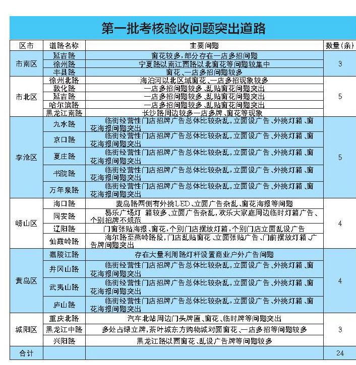 在此次臨街門店招牌、戶外廣告和夜景亮化設施集中整治行動中,市南區有13條道路,問題數量449處,市北區有12條道路,問題624處,李滄區和嶗山區分別有10條道路,問題分別為448處和191處,黃島區有18條道路,問題142處,城陽區有10條道路,問題229處,高新區有5條道路,問題7處。