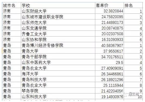 青島的高校方面,青島博川經濟專修學院單筆訂單均價最高,平均為40元/單。青島大學排名第二,單筆訂單均價為37元,青島干部學院、山東中醫藥大學、青島農業大學分別以34元/單、29元/單、27元/單位居3-5位。
