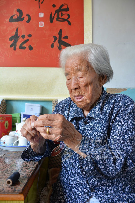 “我媽身體非常健康,比我都好。”85歲的大兒子徐永才介紹,母親徐姜氏出生于1912年1月15日,老人沒上過一天學(xué),只認(rèn)識自己的名字卻不會寫,但她卻親手將三代人撫養(yǎng)得很好。現(xiàn)年106歲的徐姜氏耳不聾,眼不花,走起路來健步如飛,穿針引線也不在話下。“母親共養(yǎng)育了我們10個兒女,8個男孩,2個女孩。”大兒子徐永才說,除了五弟三年前因病去世外,全家五世同堂102人。最小的弟弟徐永國今年也60歲了。每年的臘月初八是徐姜氏老人的生日,這一天是全村最熱鬧的一天,不光全家人回來祝壽,村里的、鄰村的老人也來祝壽,沾沾老人長壽的喜氣。
