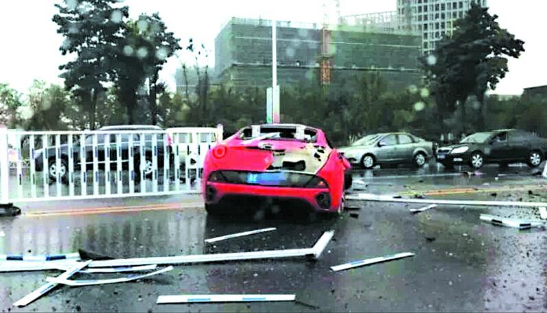 雨天路滑 唐島灣附近一法拉利撞壞幾十節(jié)護(hù)欄