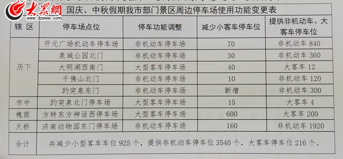 大眾網濟南9月29日訊 記者從濟南交警支隊獲悉,今年國慶中秋假期濟南市區開元廣場、泉城公園北門、大明城西南門、千佛山北門、趵突泉東門、趵突泉北門、方特東方神話西停車場、濟南動物園東門停車場等8處公用停車場,將延續“僅供公共交通車輛、應急車輛停放”的政策,共減少小型客車車位925個,提供非機動車停車位3540個,大客車停車位216個。2016年國慶長假期間,濟南市共處罰違法停車7467起,主要集中在市區內的景區、商圈周邊。部分市民以及外地游客執意開車前往上述景區周邊,導致車輛亂停亂放、周邊道路通行效率降低。(大眾網—山東24小時記者 賀輝)