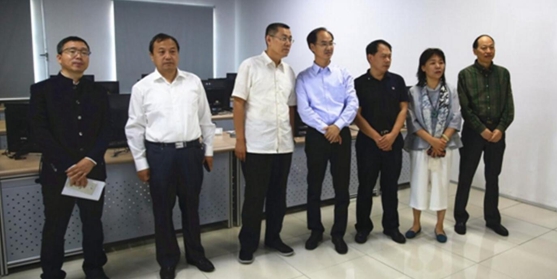 山東省政府新聞辦主任魏長民(左四)蒞臨演播室,中國孔子基金會理事長王大千(左三)等陪同并介紹直播情況