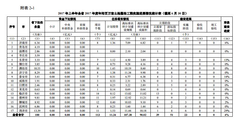 2017上半年全省2017年度年均百萬畝土地整治工程實施進展情況統計表(截至6月30日)
