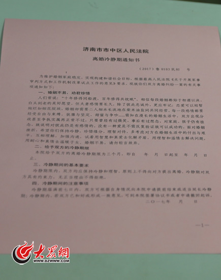 濟南市市中區法院推出“離婚冷靜期”制度以來,已經發出3份冷靜通知書