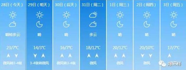 明天夜間到29日多云轉(zhuǎn)晴,北風(fēng)4級陣風(fēng)6~7級,最低氣溫濟(jì)陽、商河4℃左右,市區(qū)及其它縣區(qū)6℃左右,最高氣溫17℃左右,出現(xiàn)在明天夜間。