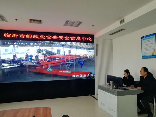 11月10日,臨沂市郵政業公共安全信息中心的屏幕上,顯示著圓通分撥中心現場分揀實況。