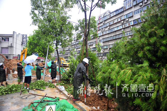 近日,在濟南飲虎池街,施工人員正在重新規劃好的綠化帶中種植植被。 記者 王媛 攝
