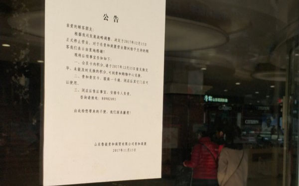 公告稱:“根據我司發展戰略調整,決定于2017年12月15日停止營業,對于在貴和商廈營業期間給予支持的顧客我們表示由衷感謝!”