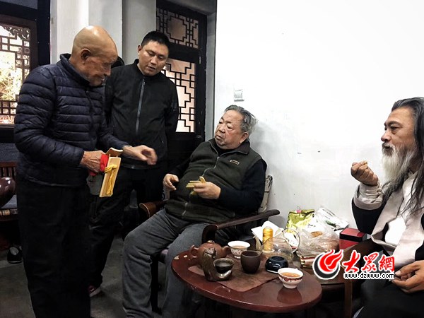李濤與芙蓉館演員王文喜(左一)、張存珠(左三)討論快板。大眾網(wǎng) 記者 張瑪睿 攝