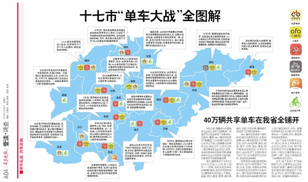 今年以來,隨著各大共享單車企業在山東的“攻城略地”,我省17地市已經全部都有了共享單車。這其中,摩拜、ofo小黃車和哈羅這“橙黃藍”三大品牌已經成為山東本土市場上規模最大的單車企業。除此之外,山東本土的一些共享單車企業也加入進來,全省共享單車約有40萬輛。隨著各單車企業之間競爭的日益加劇,共享單車市場面臨著洗牌。