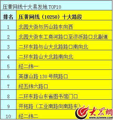 濟南市區騎壓黃網線違法的10大易發地為:北園大街與歷山路東向西、北園大街東工商河路口至濟濼路口北副道、二環東路與山大北路路口南向北、二環東路山大北路南向北、經二緯一、英雄山路130號院路口、經五緯六路口、二環東路山東省圖書館門口、開拓路(工業南路向南路東)、經二緯二。