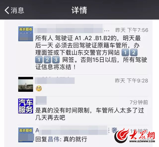 微信謠言截圖(圖片有濟南市車管所提供)